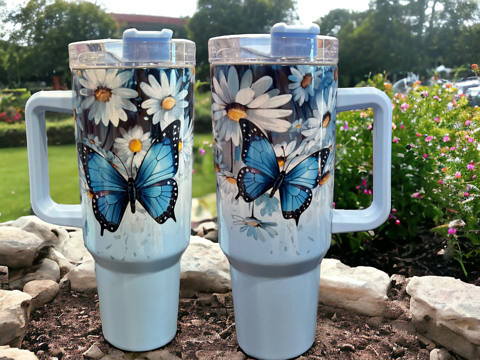 40oz Stanley Style Thirst Quencher Tumblers -butterflies blue/white, holographic sparkle