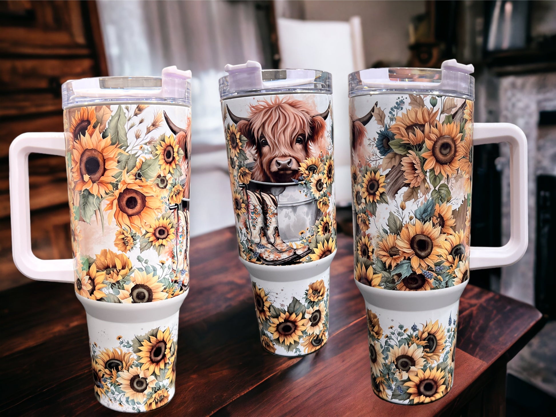 Introducing our 40oz Stainless Steel Travel Cup with Handle, featuring a delightful engraved design of a cow relaxing in a bucket surrounded by Sunflowers — a fun and heartwarming twist on farmhouse style!