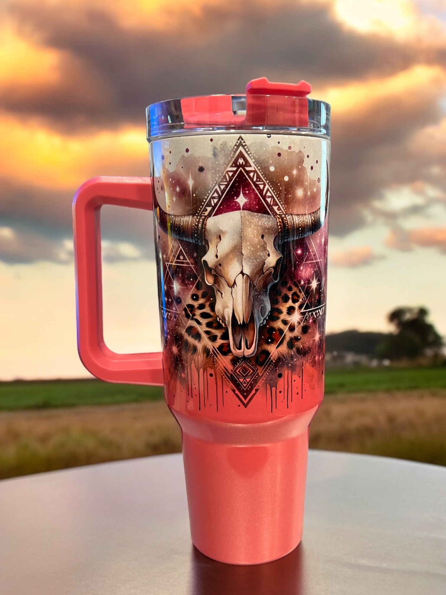 40oz Stanley Style Thirst Quencher Tumblers -cow skull- pink/white holographic glitter