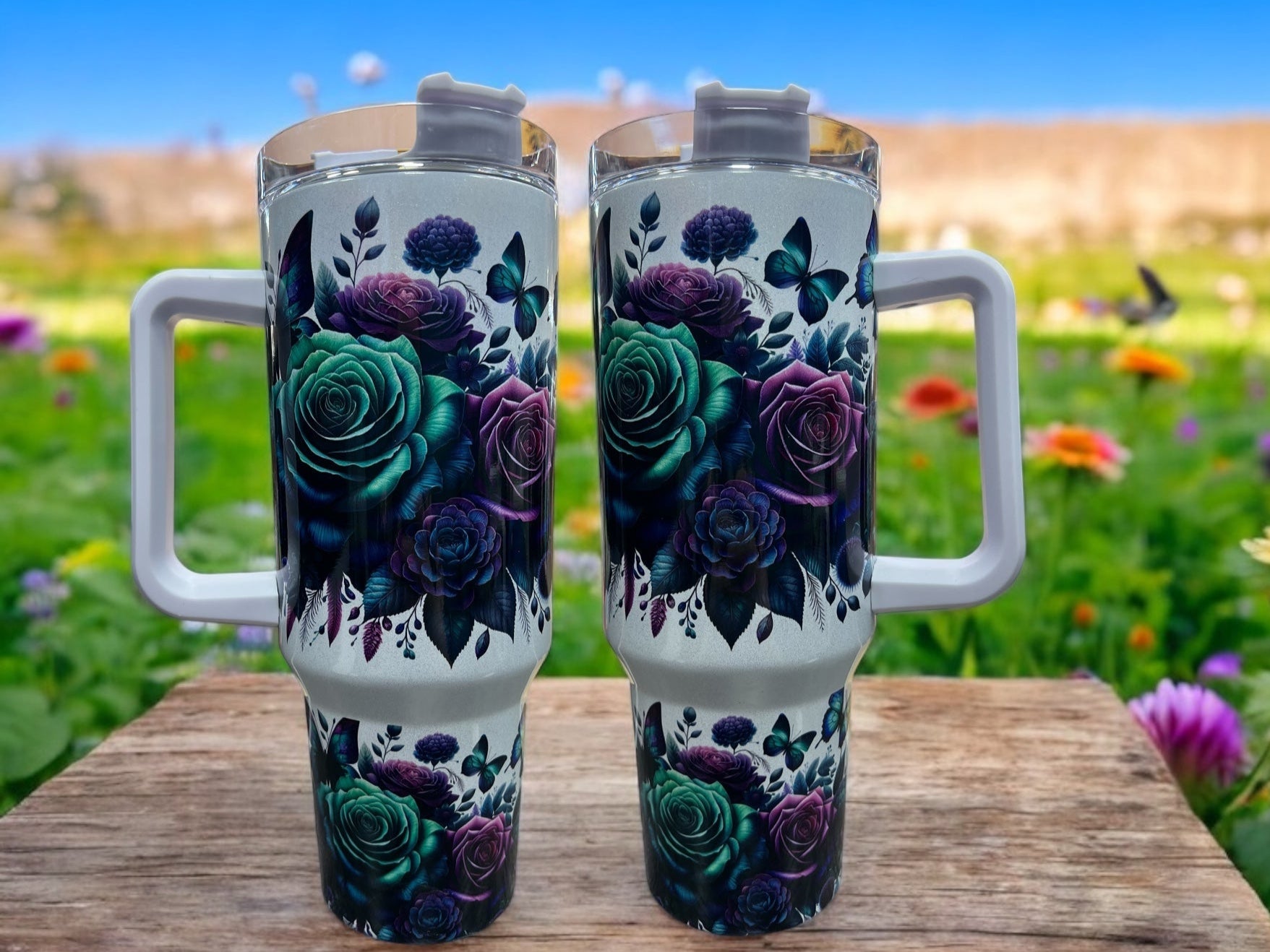 Butterflies and Flowers purple/Teal Holographic Sparkle 40oz Cup Water Bottles - Reusable Portable Drinkware for Everyday Use