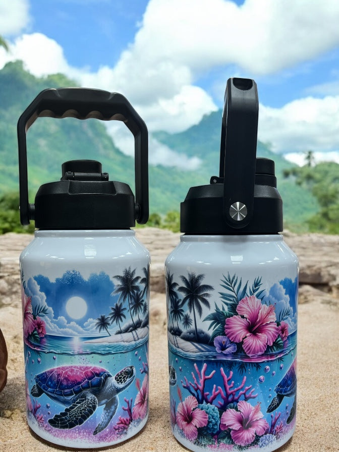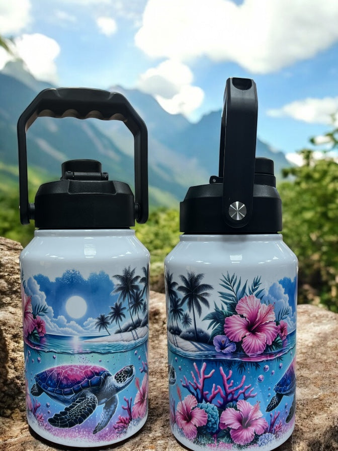 Channel ocean vibes and coastal calm with this stunning 70oz stainless steel water bottle, featuring a beautifully detailed sea turtle gliding through vibrant coral and waves.